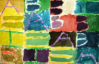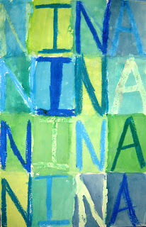 This was a great 2 day art lesson for my 1st graders. We began by folding a 12x18" white paper 4 times and opening it up to get 16 rectangles. I demonstrated how to use the letters of my name to fill up the entire space of each rectangle ( some got it!) They used oil pastels to create a bug chunky letter and then kept repeating the letters in their name until the last rectangle. Then we used watercolors to fill in the rest of the white spaces. Some of the messier ones are my favorites! :)