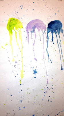 This was a quick one day lesson to go along with a sea-themed music program. I mixed up a bunch of colors of tempera paint, and watered it down a bit. Students started by painting a half circle on their paper in one color, making sure it was pretty drippy. Then they dipped their paintbrush back in the water and added more water to the bottom of their half circle. After that they picked up their paper and did a little tapping (vertically) against the table to get the tentacles to drip down. They did each jellyfish one at a time, picking a new color for each one. Finally they did a little splatter painting. This was fun- the kids really got excited when some of the tentacles ran together and changed colors.