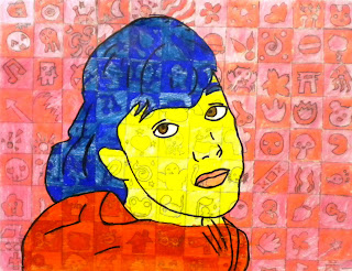 This project is finally complete and I am very happy with the results! I began by showing a powerpoint presentation on Chuck Close and his style of work. That same day I photographed each student casually as they were working at their seat in their sketchbooks. I used http://www.dumpr.net/ to turn their photo into a sketch and printed them out. Students outlined the major lines of their face with sharpie, then used a light box to transfer it onto a blank piece of 9x12 construction paper, again in sharpie. Next step is to draw a 1"x1" grid over the top of their portrait with a ruler and pencil, covering the entire page. In each box, with a pencil they drew a simple design, pattern, or object. Finally they used colored pencils to color in their designs. For each section (background, hair, skin, and clothes) they had to use a different 2-color combo. They did a wonderful job with these and were very proud of them!
